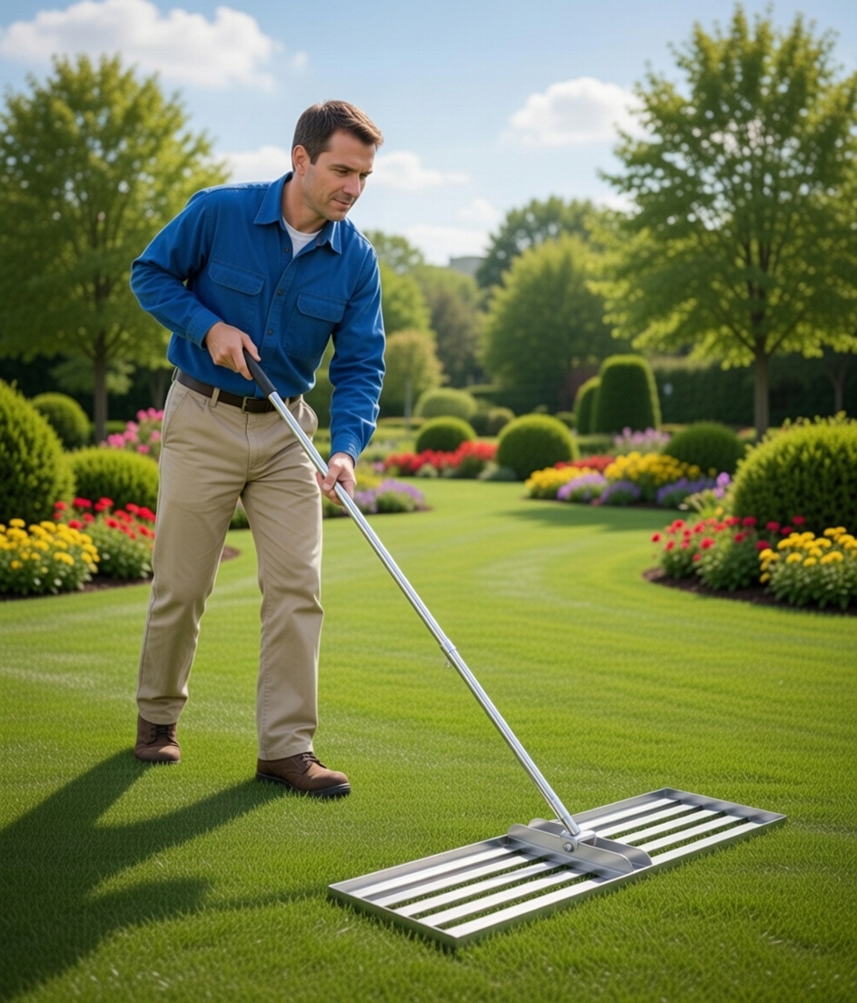 SKUTECZNY- niwelator jest niezwykle skuteczny w usuwaniu nierówności terenu. Służy do wyrównywania powierzchni gruntu, piaskowania trawnika po aeracji oraz do aplikacji top dressingów, co znacząco poprawia estetykę ogrodu i ułatwia jego pielęgnację.