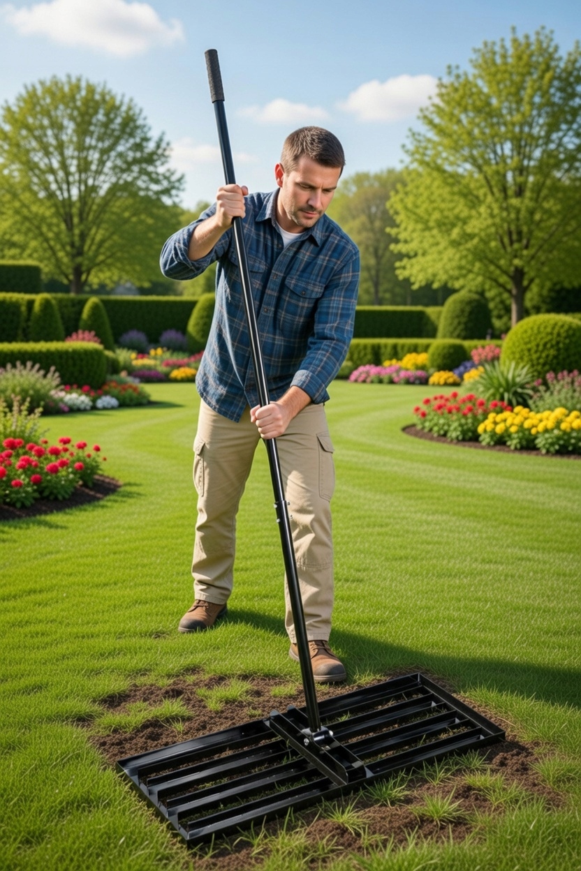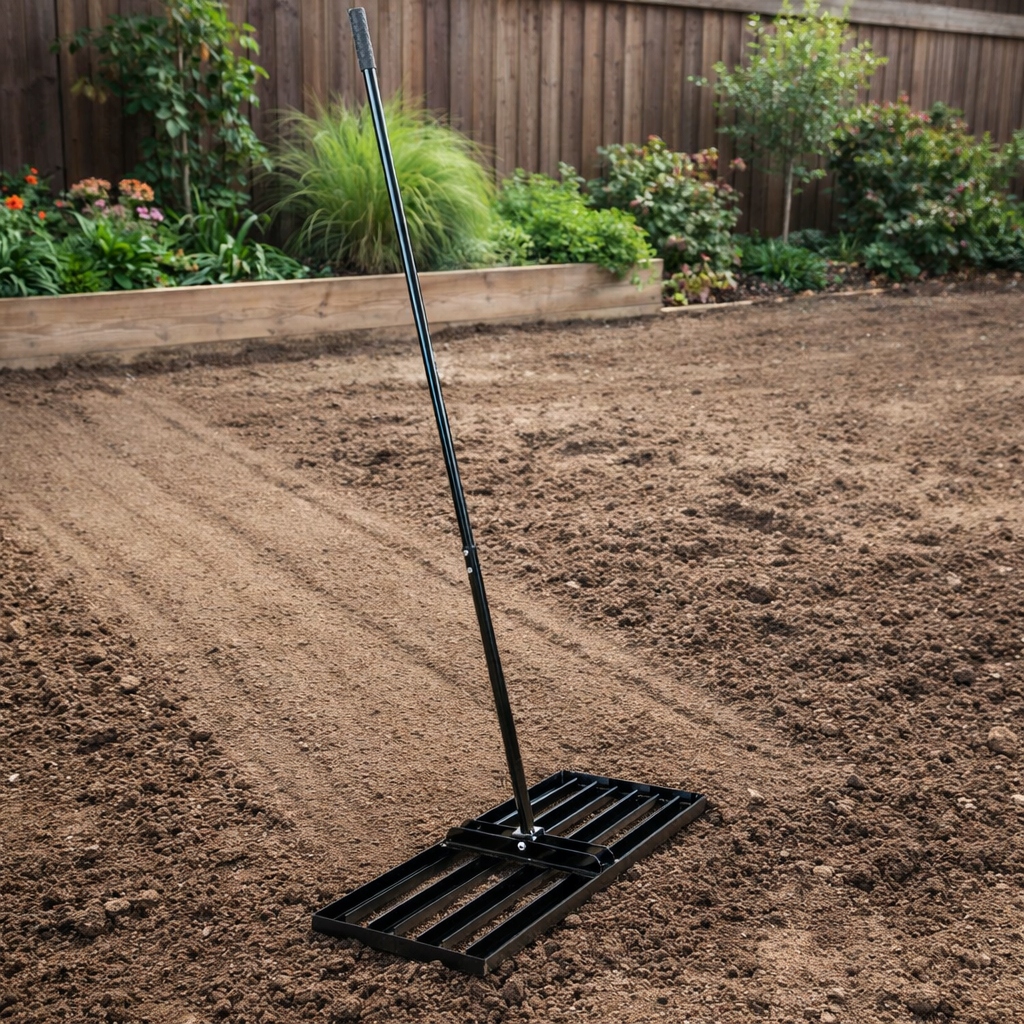 Niwelator terenu ogrodowy – to narzędzie używane do wyrównywania powierzchni ziemi w ogrodzie. Służy do rozprowadzania i wygładzania gleby, aby teren był równy przed założeniem trawnika, rabat lub ścieżek.