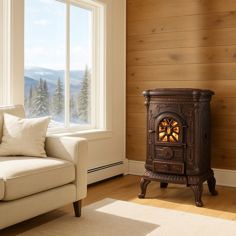 Przytulny ciepły dom na wyciągnięcie ręki! Kominek Ambra w kolorze złotym został wykonany z wysokiej jakości odlewu żeliwnego o imponującej grubości 11 mm, co gwarantuje długie utrzymywanie ciepła oraz niezawodne działanie przez lata. Z mocą grzewczą do 9 kW, spełniającą normy Ekoprojektu, świetnie sprawdzi się w domach, domkach letniskowych i większych pomieszczeniach – ogrzewając nawet do 80 m².  Łączy klasyczną formę z luksusowym wykończeniem, stając się sercem każdego pomieszczenia.