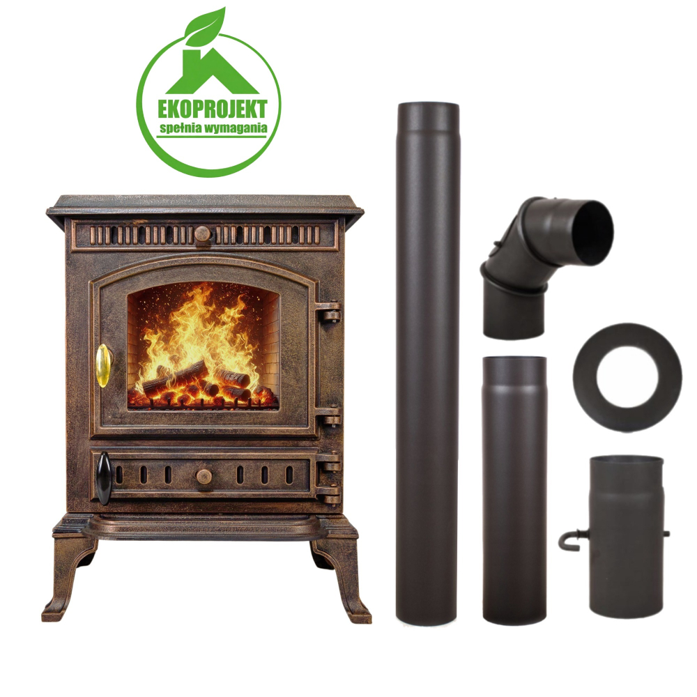 ZESTAW PIEC KOMINEK ŻELIWNY ZŁOTY ATENA + RURY PRZYĄCZENIOWE FI 130MM
